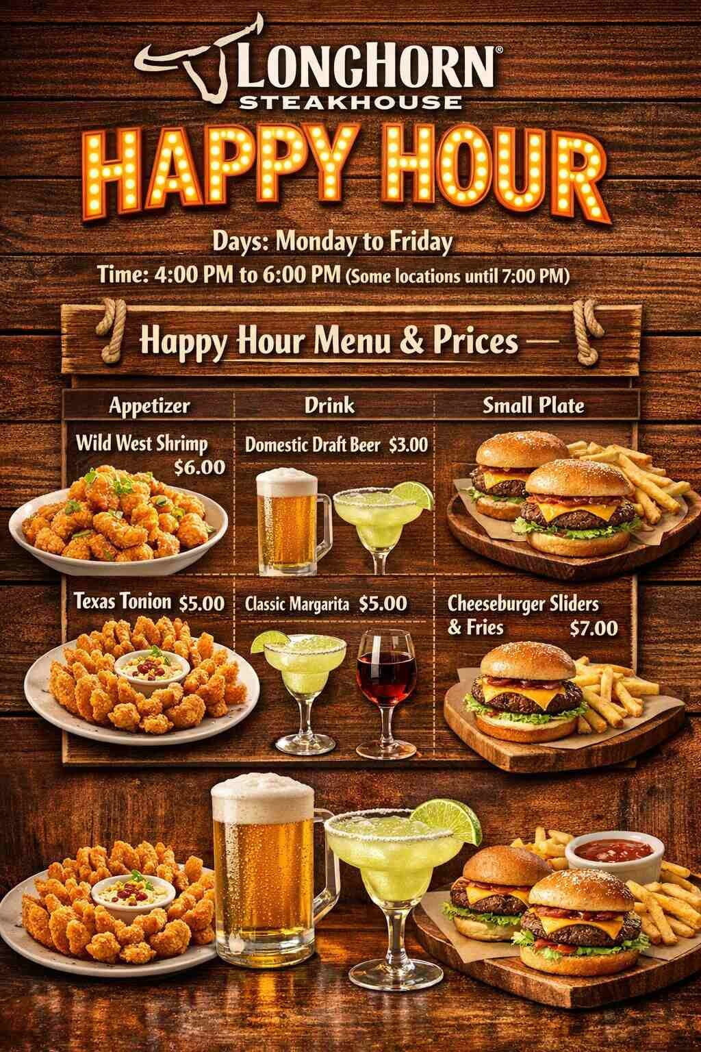 Looking for the LongHorn Steakhouse Happy Hour times and deals? Wondering what drinks and appetizers are included and how much they cost? At LongHorn Steakhouse, Happy Hour is a popular time when guests can enjoy discounted beers, cocktails, wine, and appetizers at lower prices. Most locations offer these deals Monday through Friday in the late afternoon, usually around 4 PM to 6 PM